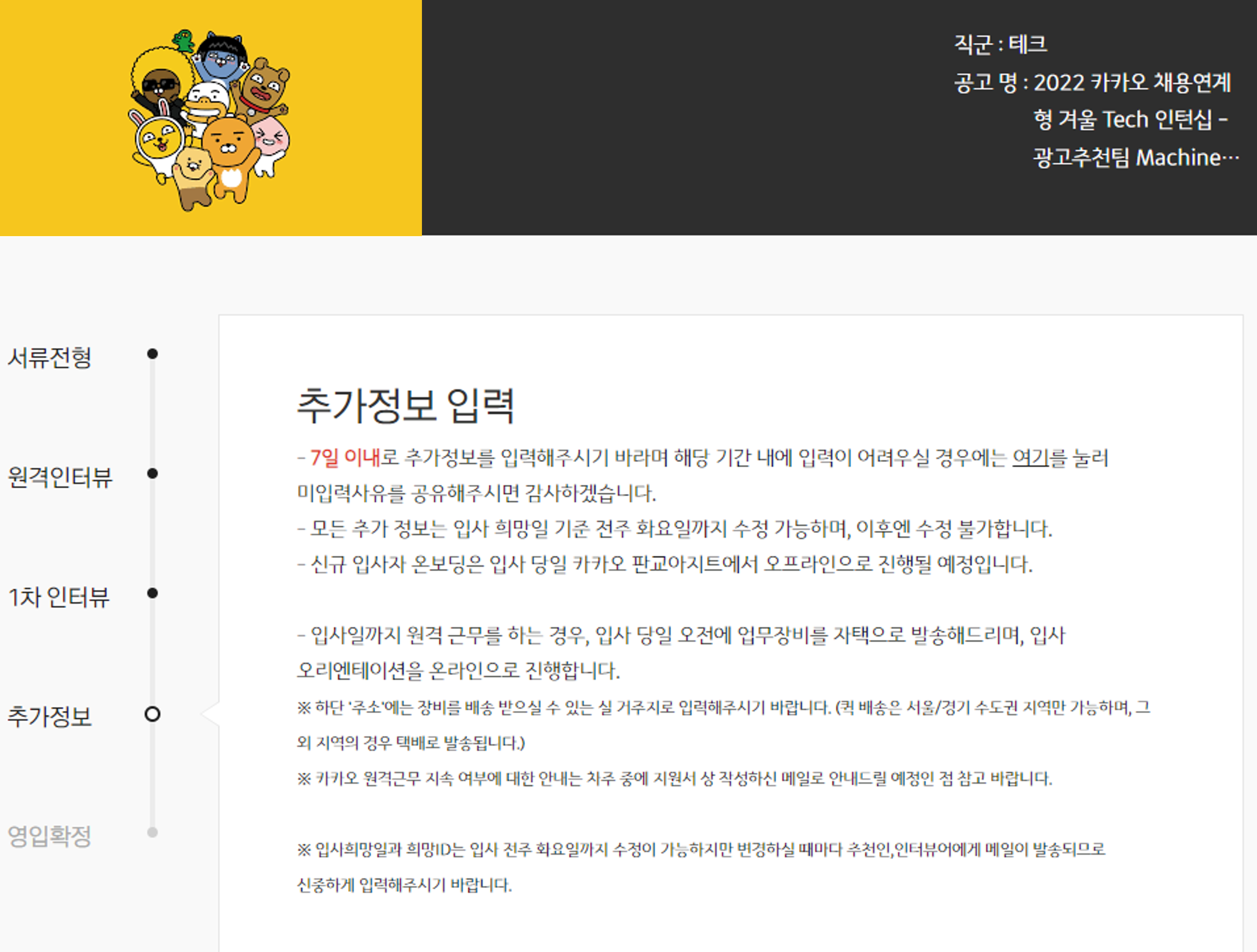 이 분야를 처음 공부하기 시작할 때부터 가장 가고 싶은 회사였고 또 최종 합격이라는 정말 좋은 기회 받았지만, 인터뷰 직후에 받은 다른 곳 정규직 최종 합격으로 인해 포기했습니다. 광고추천팀 - ML로 지원했습니다.