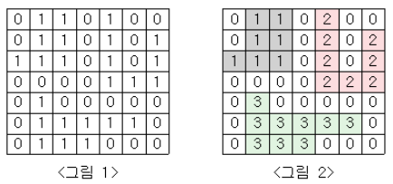 <그림 1>과 같이 정사각형 모양의 지도가 있다. 1은 집이 있는 곳을, 0은 집이 없는 곳을 나타낸다. 철수는 이 지도를 가지고 연결된 집들의 모임인 단지를 정의하고, 단지에 번호를 붙이려 한다. �